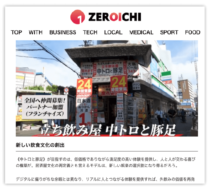 中トロと豚足のFCは2025年11月に、編集長が堀江 貴文氏(ホリエモン)のメディア「ZEROICHI」にも紹介され、