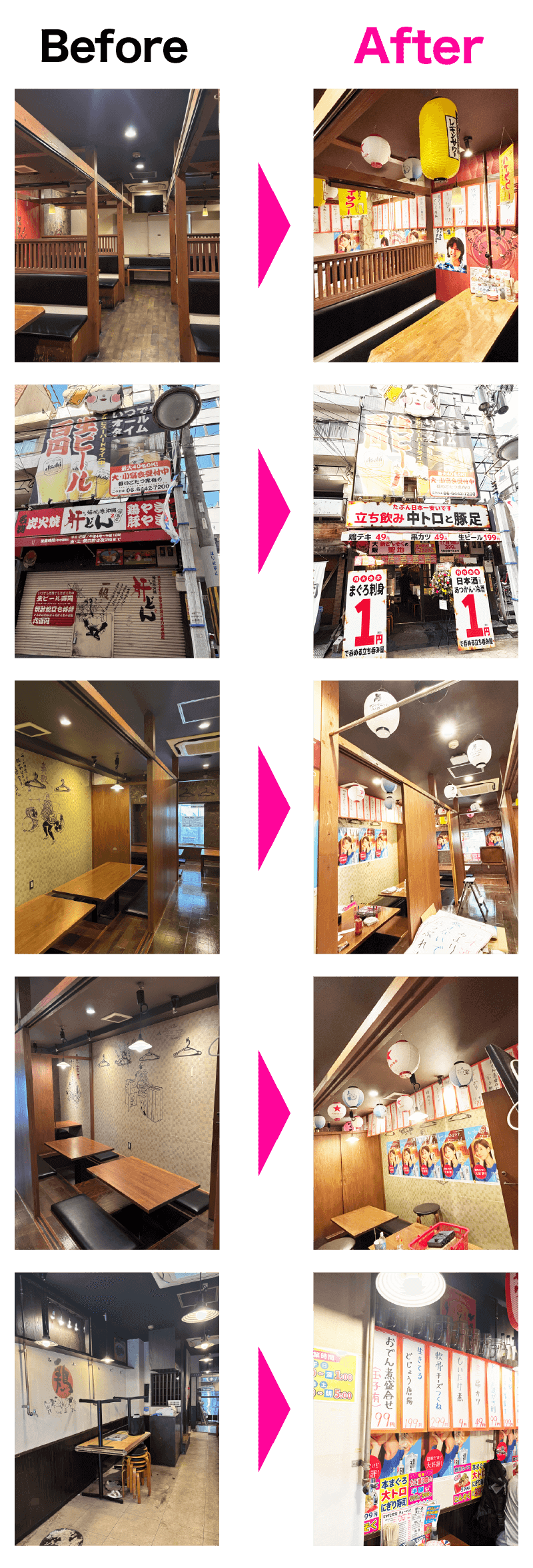 「工事はしない」が基本スタンス。看板・ポスター・提灯でイメージを作るのが基本発想。