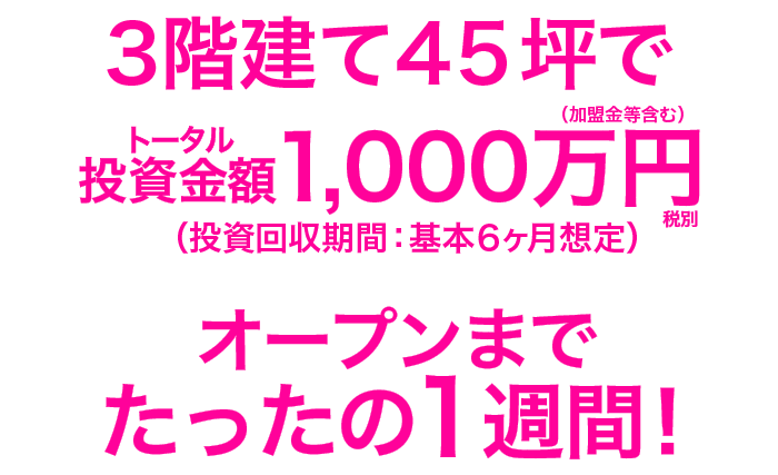 - 3階建て45坪で投資金額1,000万円税別(加盟金等含む)